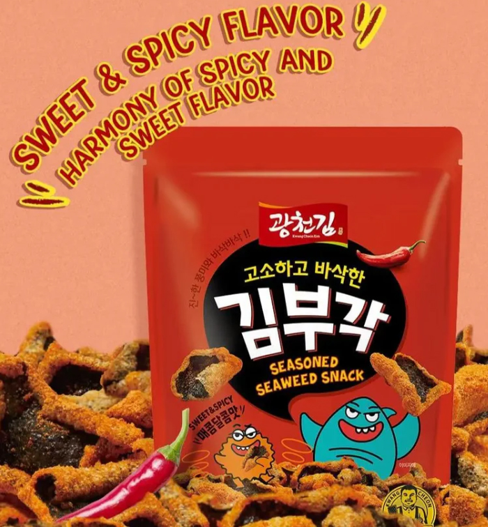 Gimbugak is a classic Korean snack traditionally made by coating sheets of seaweed with glutinous rice paste, drying them, and then deep-frying them to achieve an ultra-crispy texture. The result is a chip that’s airy, crisp, and packed with spicy-sweet umami flavor.
